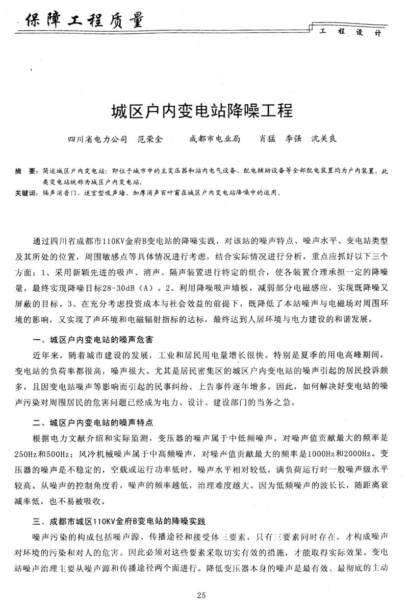 2009年3月,有關(guān)《城區(qū)戶內(nèi)變電站降噪工程》一文已發(fā)表于《聲學(xué)工程》2009年第二期25頁。全文參見“企業(yè)資質(zhì)”欄《城區(qū)戶內(nèi)變電站降噪工程》一文。
