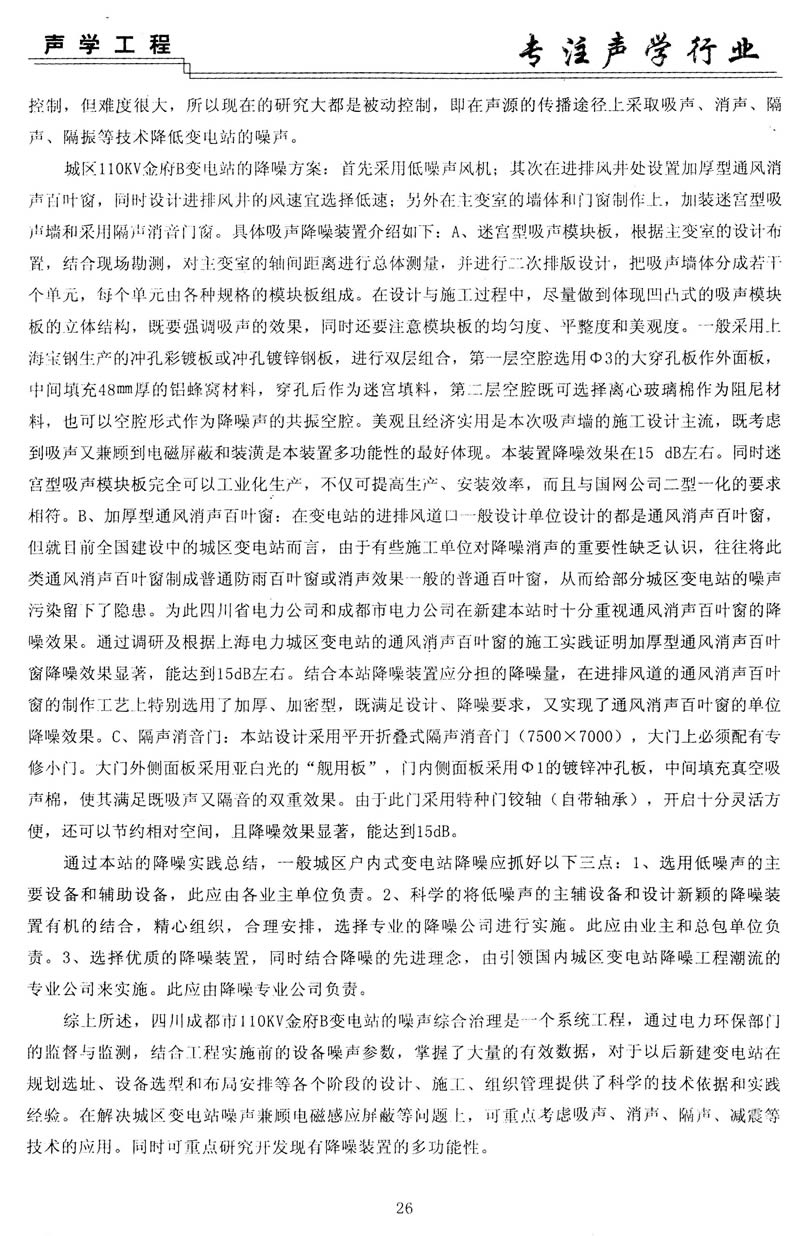 2009年3月,有關(guān)《城區(qū)戶內(nèi)變電站降噪工程》一文已發(fā)表于《聲學(xué)工程》2009年第二期25頁